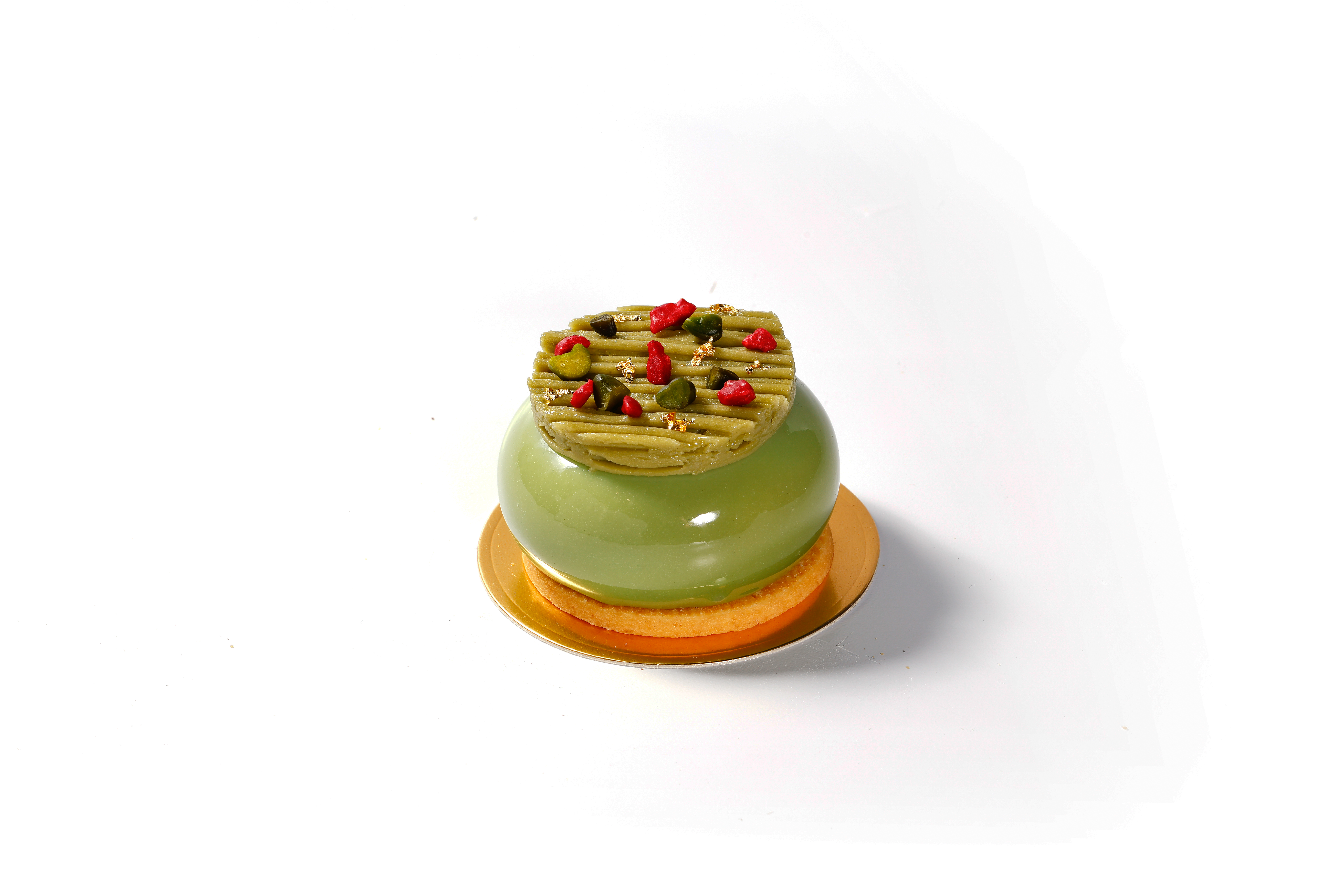 A delightful cherry jelly is encased in creamy pistachio mousse, topped with crispy raspberries and pistachios, making it an ideal treat for nut lovers